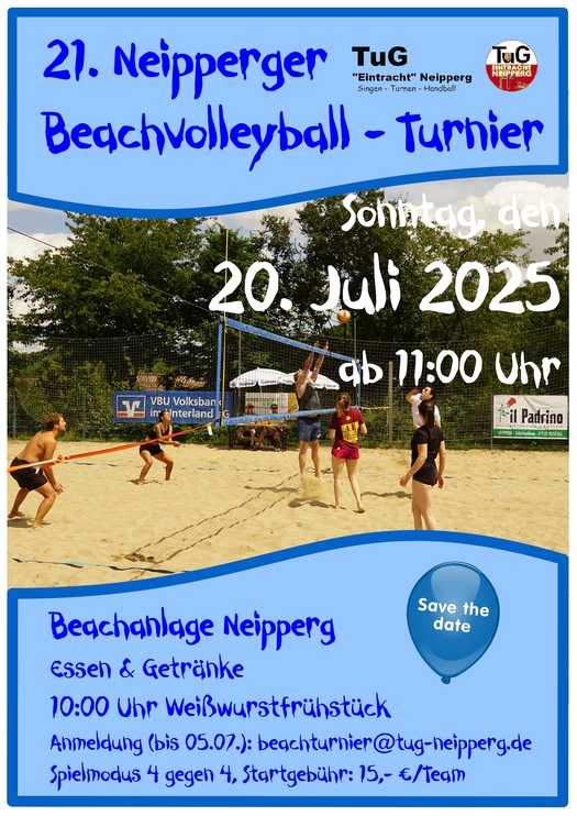 Wir freuen uns riesig auf ein sandig-sonniges Sporterlebnis. Bereits zum 21. mal möchte der TuG Neipperg bei optimalem Beachwetter sein Beachvolleyball-Turnier ausrichten. Erneut möchte der TuG wieder ein reines Männer- und ein Mixed-Turnier ausgetragen.