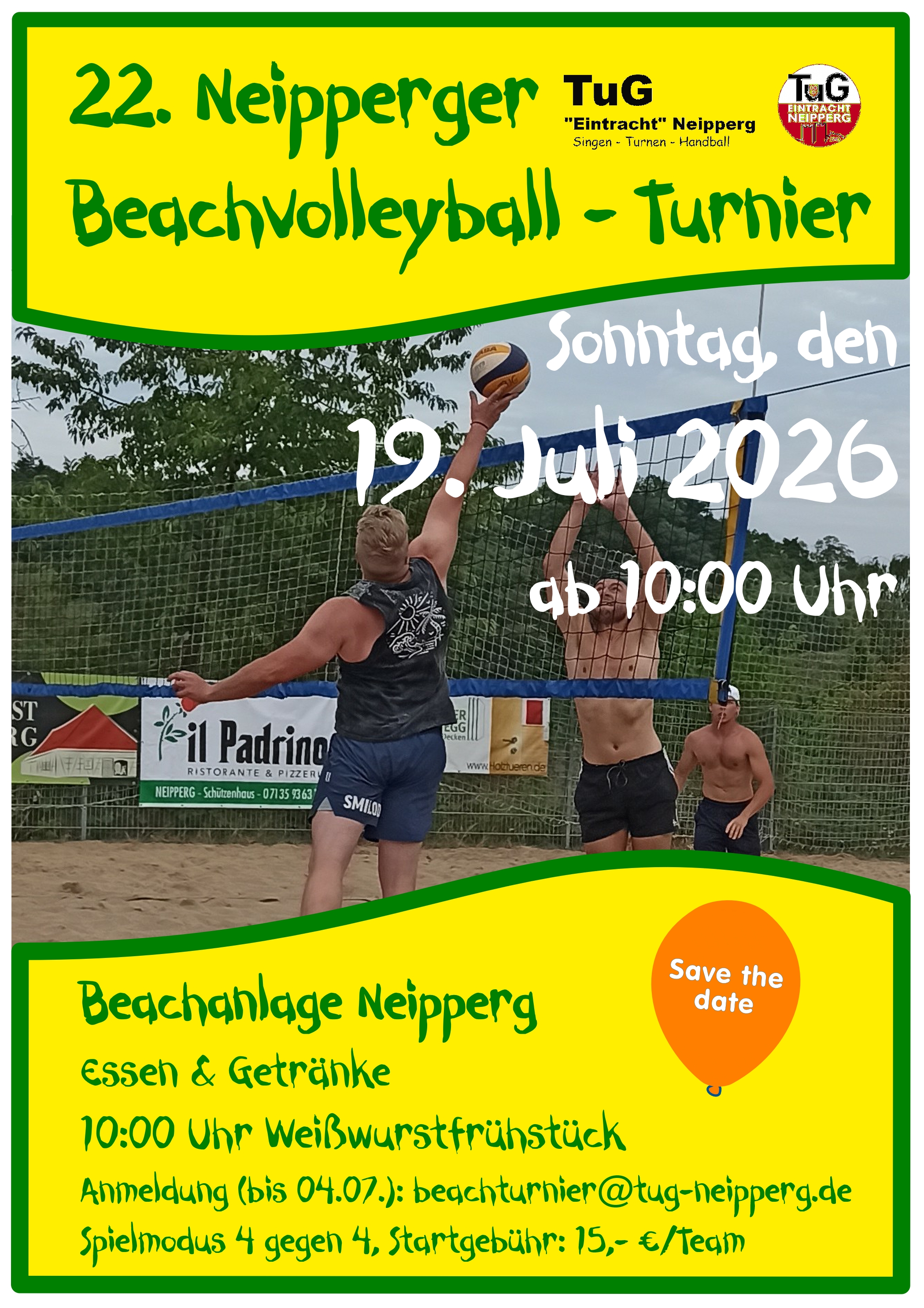 Wir freuen uns riesig auf ein sandig-sonniges Sporterlebnis. Bereits zum 22. mal möchte der TuG Neipperg bei optimalem Beachwetter sein Beachvolleyball-Turnier ausrichten. Gespielt wird in 4er Mixed-Teams, pro Team sollte höchstens ein(e) aktiver Spieler/-in auf dem Feld stehen. Jede Mannschaft verpflichtet sich einen Schiedsrichter zu stellen.